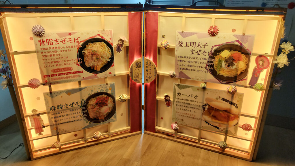 後ろからだけですと前に貼ったメニューは夜だと暗くてみえない。前からも照らすように考えないと。